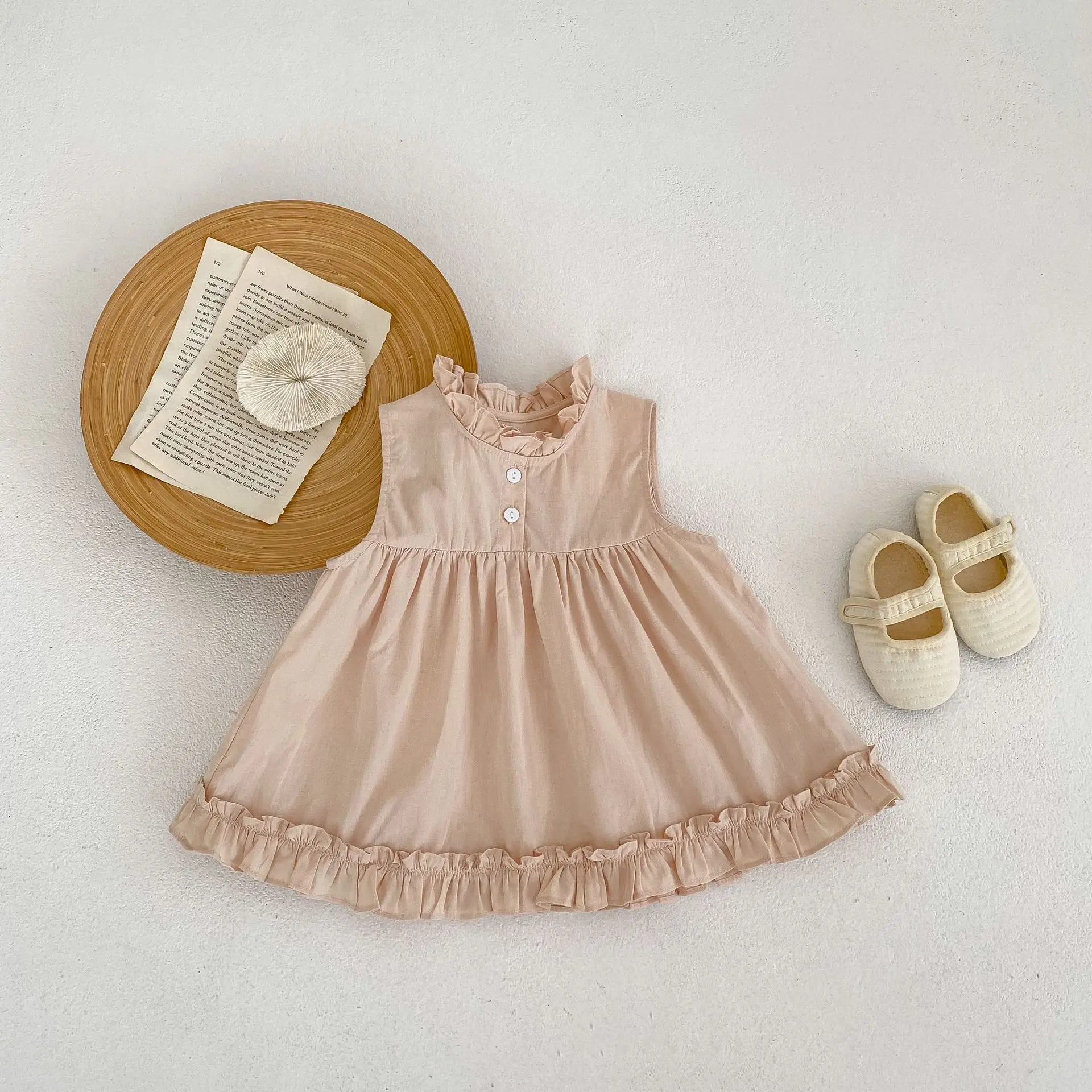 Корейская летняя одежда для детей, для девочек 2023, без рукавов, однотонное женское кружевное платье, одежда для маленьких девочек, жилет, классический Сарафан