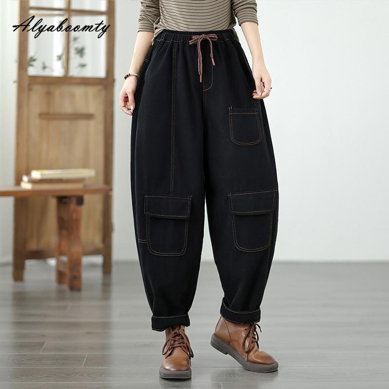 Корейская мода Осень Зима Женские джинсы галифе Эластичная талия Кулиска Повседневные Свободные Мешковатые Джинсы Стильная Уличная одежда Джинсовые брюки с карманами XXL