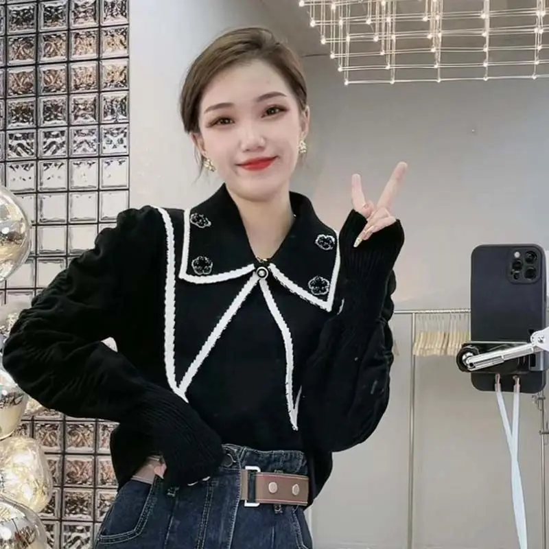 Корейский кардиган свитер знаменитостей Модный Западный дизайн темно-синий воротник пышные рукава ниша темперамент вязаный свитер женский