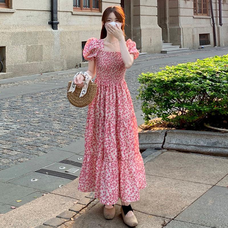 Корейский нежный стиль ретро с коротким рукавом цветочная юбка лето новый сладкий темперамент рукав-пузырь квадратный вырез талия большой размер платье M
