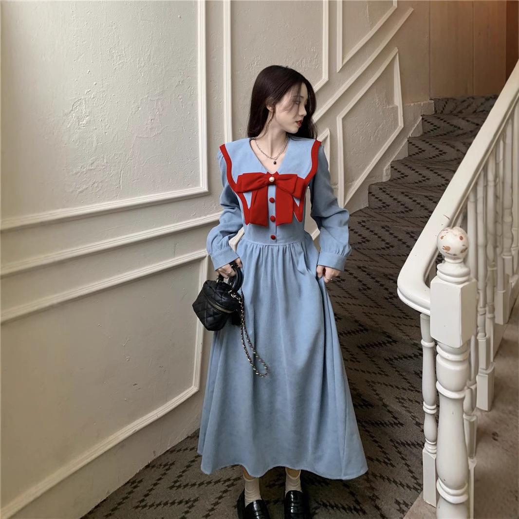 Корейское платье в стиле ретро пэчворк 2024 - Повседневное, приталенное, с бантом, средней длины XL синий