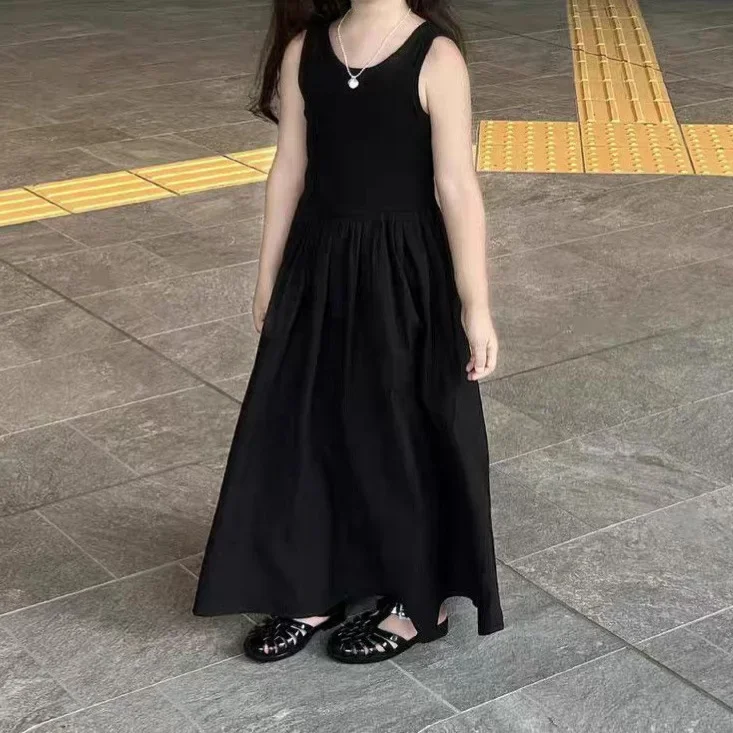 Корейское пляжное платье принцессы с открытой спиной, платье-жилет для малышей, детская одежда, платья для маленьких девочек от 2 до 10 лет, черное длинное платье, летние дети