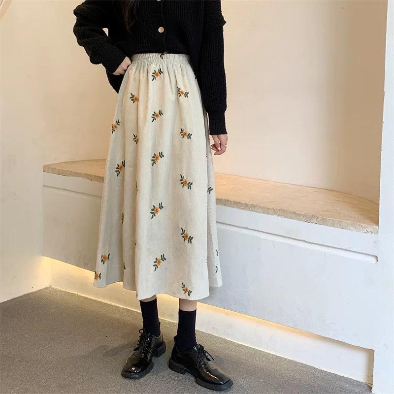 Коричневая вельветовая юбка женская вышитая цветочная юбка выше колена длинная юбка XL