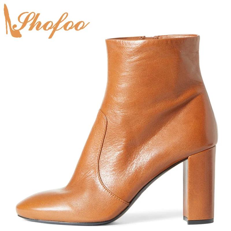 Коричневые женские ботильоны с круглым носком, ботинки на высоком массивном каблуке, женская зимняя модная обувь на молнии, большой размер 12, 15, Shofoo