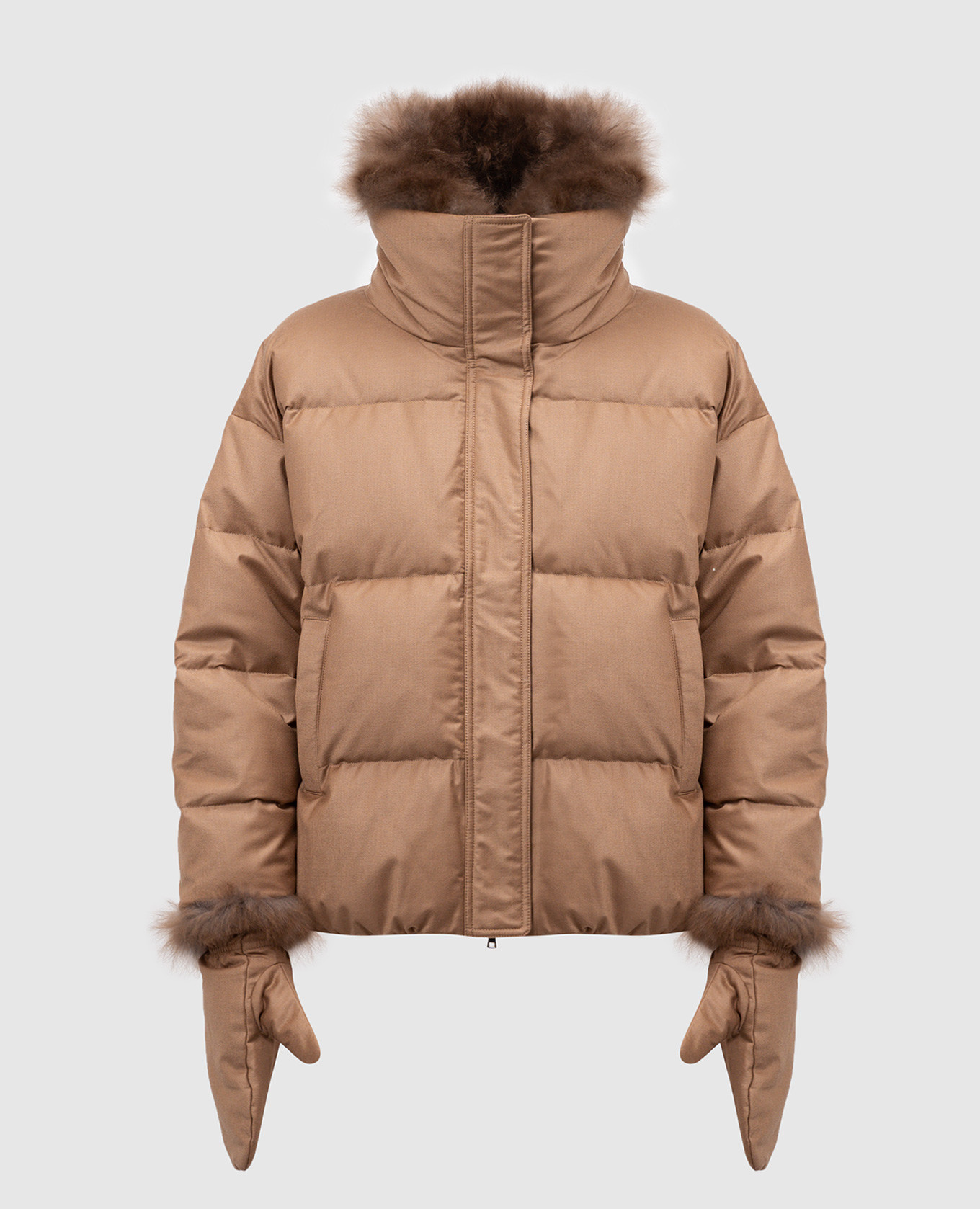 Коричневый пуховик из шерсти и шелка с перчатками, Куртки
