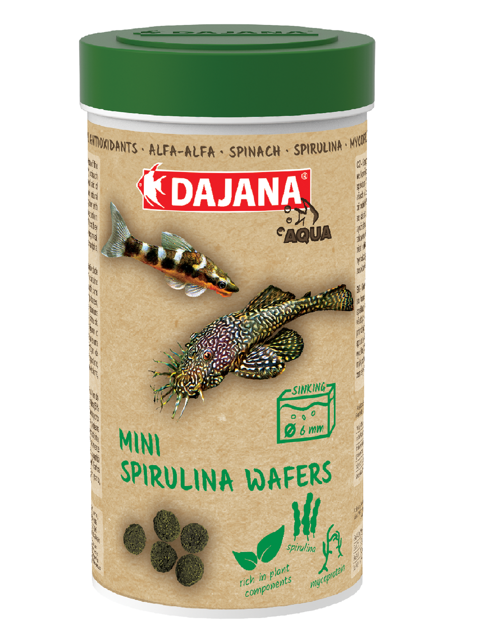 Dajana Mini Spirulina Wafers - корм в виде погружных таблеток, высокого качества, для декоративных растительноядных рыбок на дне аквариума. Содержит водоросли спирулина, морские водоросли, шпинат, натуральные каротины и широкий спектр высококачественного сырья в оптимальной сбалансированной формуле, которая включает в себя все необходимые вещества, в частности, растительные и животные белки, минералы и натуральные витамины.
