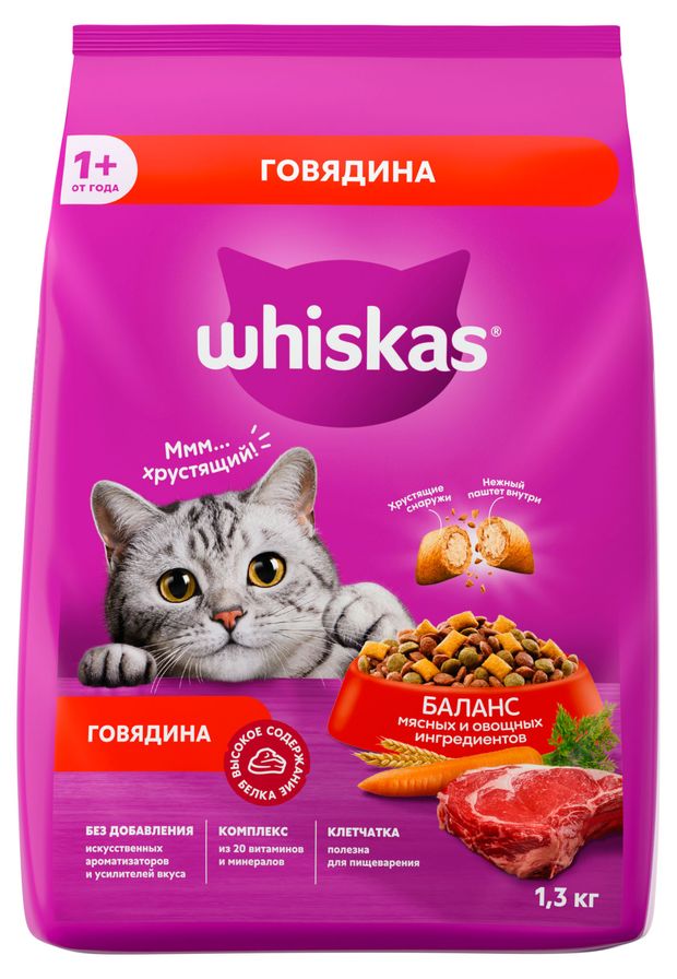 Корм сухой Whiskas Вкусные подушечки с нежным паштетом с говядиной для взрослых кошек 1.3 кг