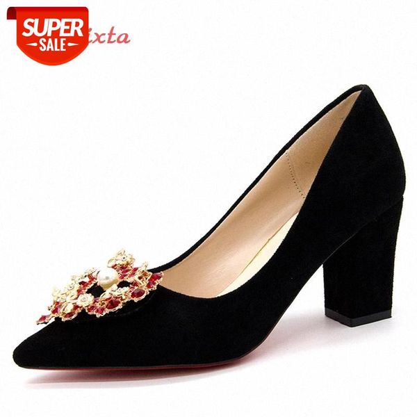aphixta heels shoes women square heel women pointed toe fashion flock leather black party shoes metal pearl buckle pumps woman #bz9y