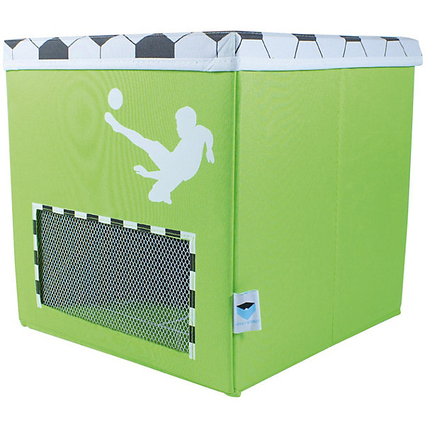 Белый силуэт футболиста и прямоугольные ворота с магнитной сеткой на одной из граней бокса в сочетании с черно-белым футбольным принтом на крышке смотрятся очень оригинально. На дне контейнера нарисовано футбольное поле.