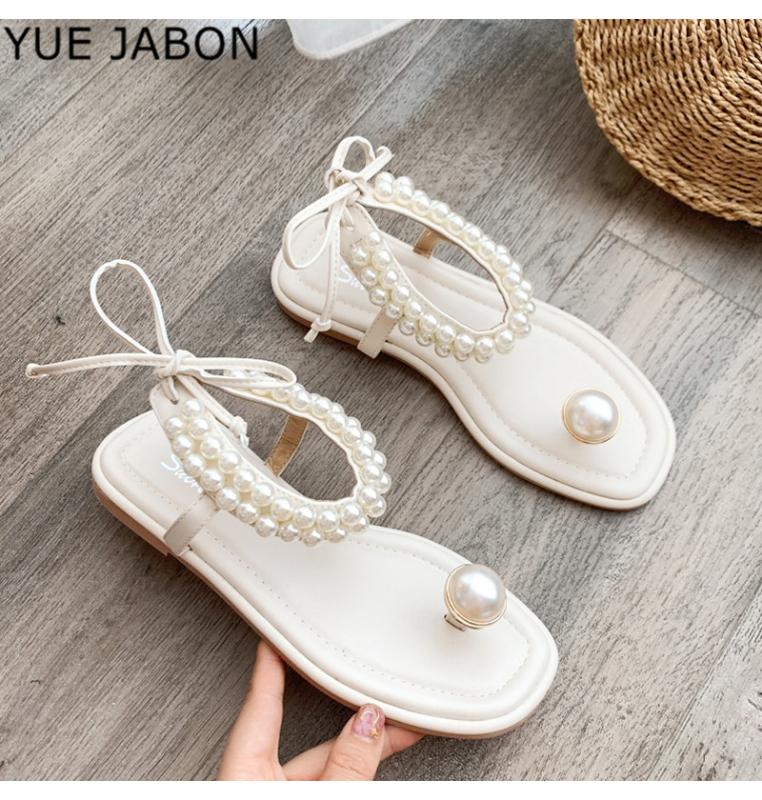 Pearl Flip Flops Women Flat Shoes Square Toe Ankle Strap Sandals Female Fashion Summer Slipper Back Bow Designer Show Woman 2020, As pictures