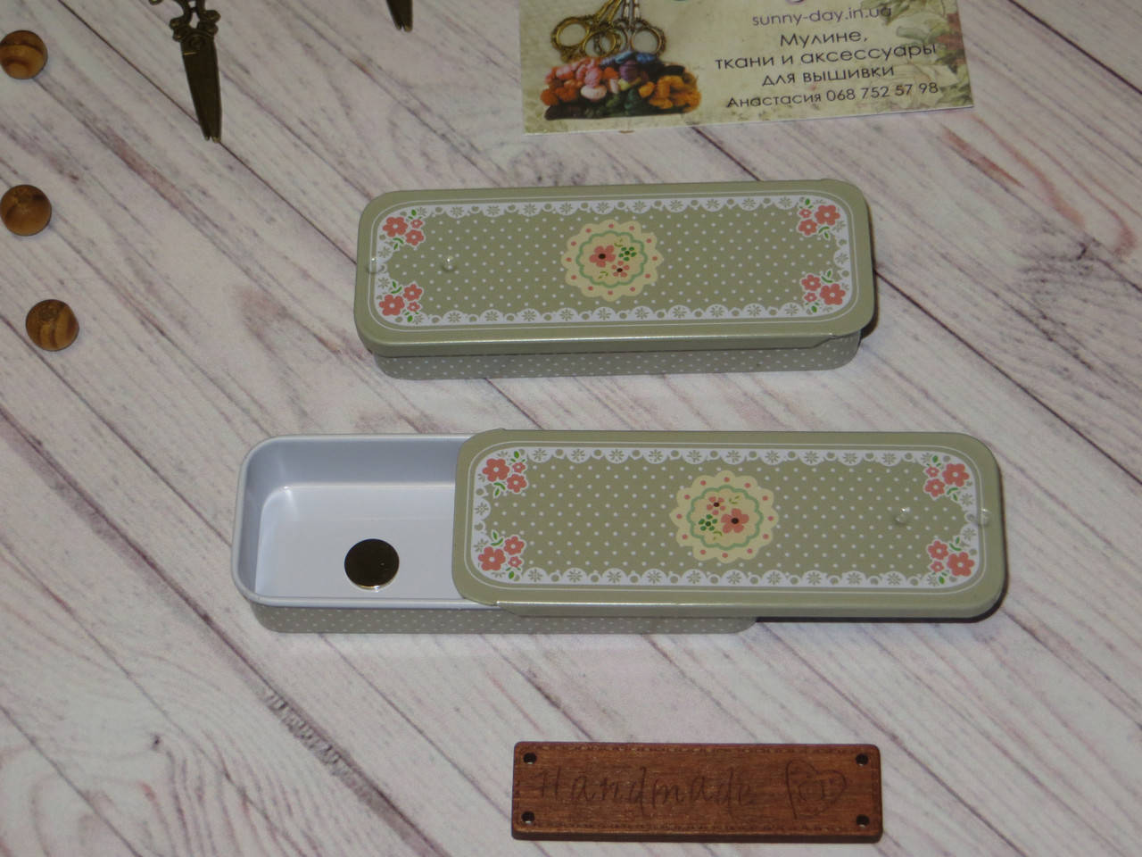 Жестяная коробочка с выдвижной крышкой для хранения иголочек и других аксессуаров.