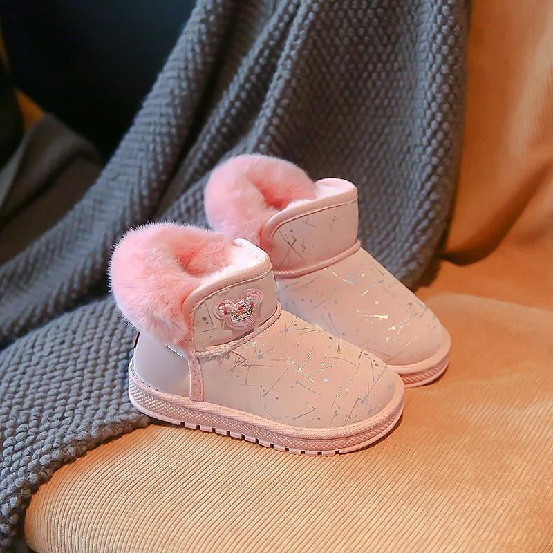 Короткие ботинки для девочек с милым медведем, детские зимние ботинки, нескользящие, без застежек, 2024, зимние новые модные детские ботинки принцессы с густым мехом 26 розовый