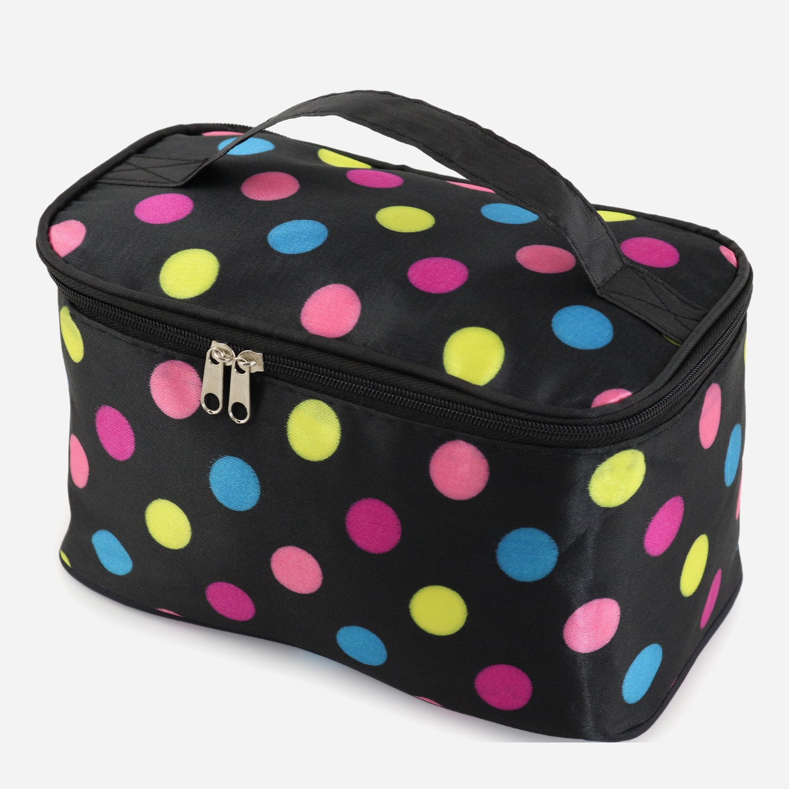 Квадратная косметичка черного цвета с принтом разноцветного горошка, на молнии.На внутренней стороне крышки 4 отделения для кистей, туши и карандашей с фиксатором.