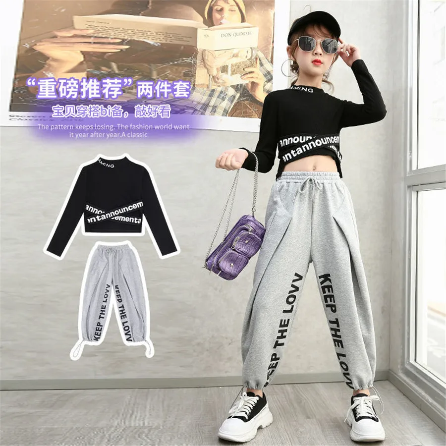 Костюм Джаз для девочек, одежда в стиле хип-хоп, черные топы с длинным рукавом, штаны в стиле хип-хоп, детская одежда для выступлений и танцев в современном стиле