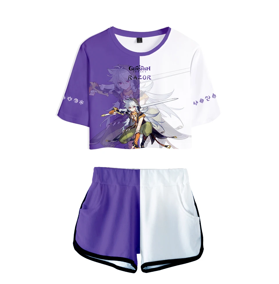 Костюм Женский Повседневный из двух предметов, Эротичные шорты с коротким рукавом и 3D-принтом Genshin, красно-белые футболки с принтом росы и пу...