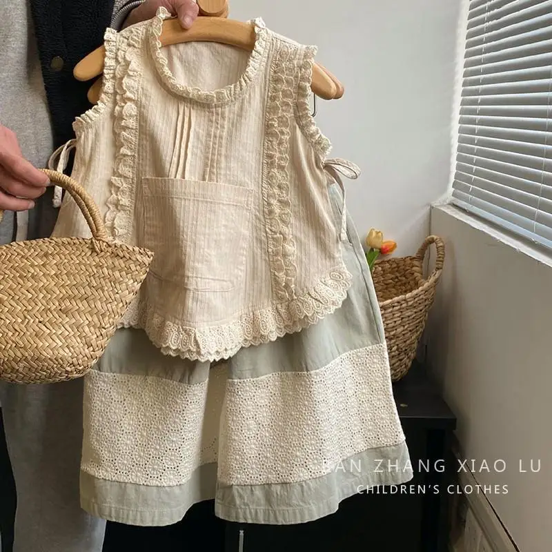 Костюм для девочек, кружевная майка с вышивкой, рубашка, Тонкий Топ без рукавов в Корейском стиле + свободные брюки, верхняя одежда, повседневный комплект из 2 предметов, домашняя одежда