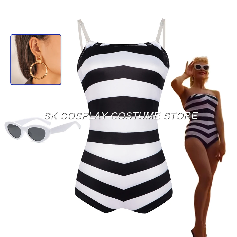 Костюм для косплея Barbi из фильма, серьги в форме глаз, женский летний купальник, черный, белый, полосатый купальник, костюм для пляжа, ванной, Хэллоуин
