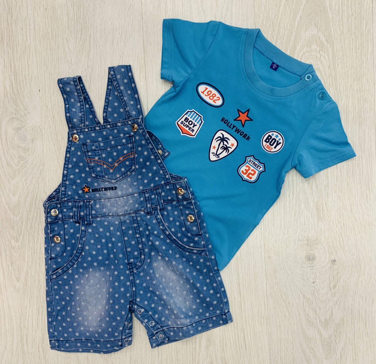 Костюм для мальчика летний футболка и джинсовый комбинезон, размеры соответствуют росту. Очень стильный костюм на лето.