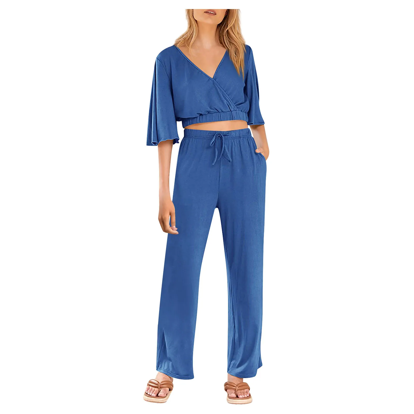 Костюм женский летний из двух предметов с V-образным вырезом, однотонный Повседневный длинный брючный костюм с короткими рукавами, эластичным поясом, уличный стиль, свободный спортивный костюм