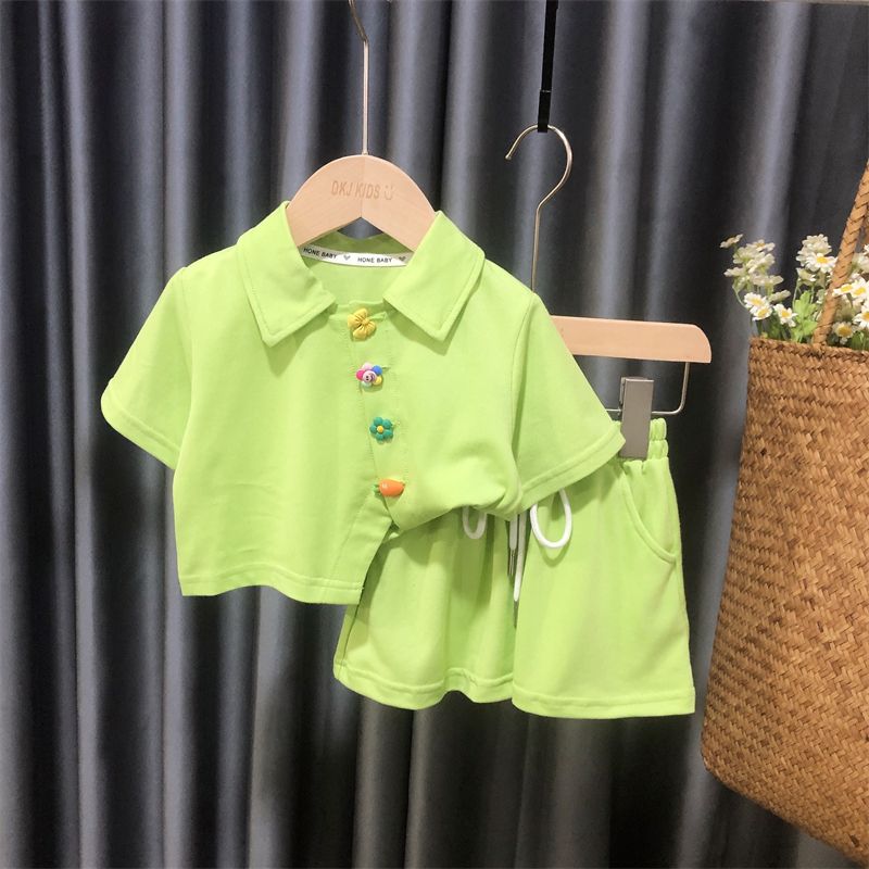 Костюм с короткими рукавами для девочек, детская рубашка-поло, спортивная модная одежда, летняя тонкая дышащая удобная комплект из двух предметов 90cm зелёный