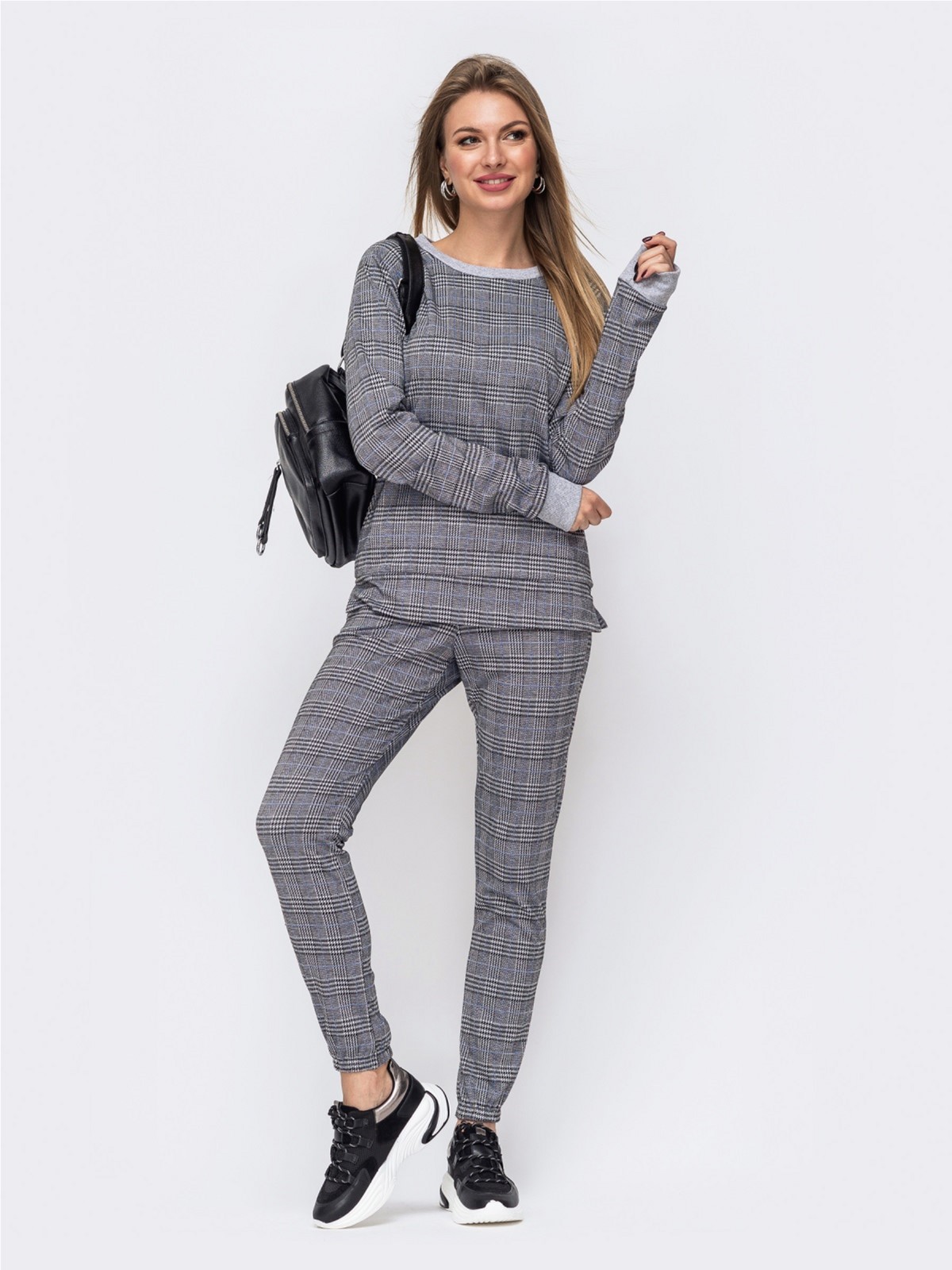 Dressa представяет десятки моделей кардиганов, платьев, свитеров и другой одежды. Выбирать можно не только по фасону, но также по составу, цвету, и размеру. Создавая модный образ, стоит учитывать все возможные параметры. Особенности модели: Повседневный комплект-двойка: кофта+брюки. Верх с рукавом-реглан, манжеты из трикотажа, по бокам разрезы. Низ изделия с высокой посадкой по талии шлевки. На модели представлен 44 размер. Замеры кофта: Длина по спинке – 66 см. Длина рукава – 79 см. Замеры брюк: Длина внешнего шва – 99 см. Длина внутреннего шва – 72 см.