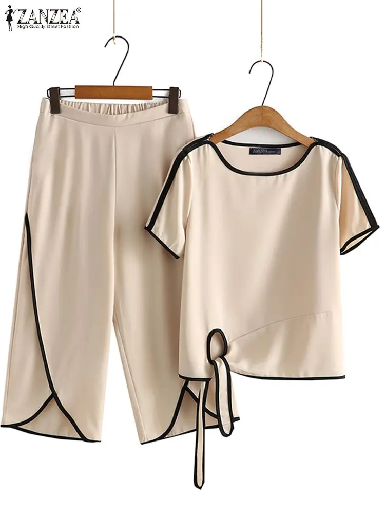 Костюм ZANZEA женский летний из 2 предметов, модные брюки с цветными вставками, повседневный бандажный топ с вырезами, винтажный наряд с разрезными манжетами