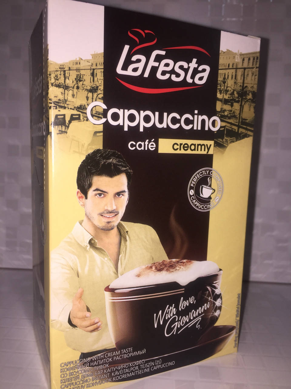 Капучино Ла Феста Один из самых распостраненных напитков на основе кофе, теперь можно быстро и вкусно приготовить в считаные секунды. Для приготовления одной порции капучино вам понадобится только горячая вода и один пакетик капучино. В Состав капучино входит: сахар, растительный жир, сливки сухие, сухое молоко, ароматизаторы и карамельный сахар.