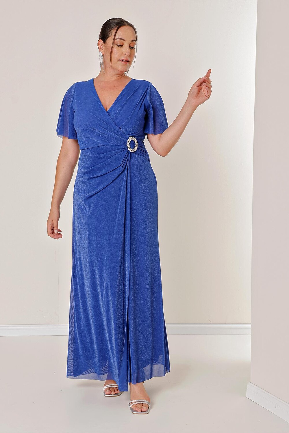 Двубортный вырез с пряжкой на талии Рукава с воланами на подкладке Длинное платье больших размеров с люрексом By Saygı, темно-синий