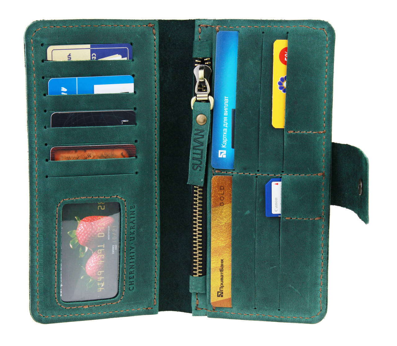 Кошелек женский кожаный большой SULLIVAN. Натуральная кожа crazy horse. Ручная работа. Внутри два отделения для банкнот, одно отделение на молнии. 15 карманов для карт, один из которых прозрачный. Застежка на кнопке. Размер (см): 19*9,5*1.