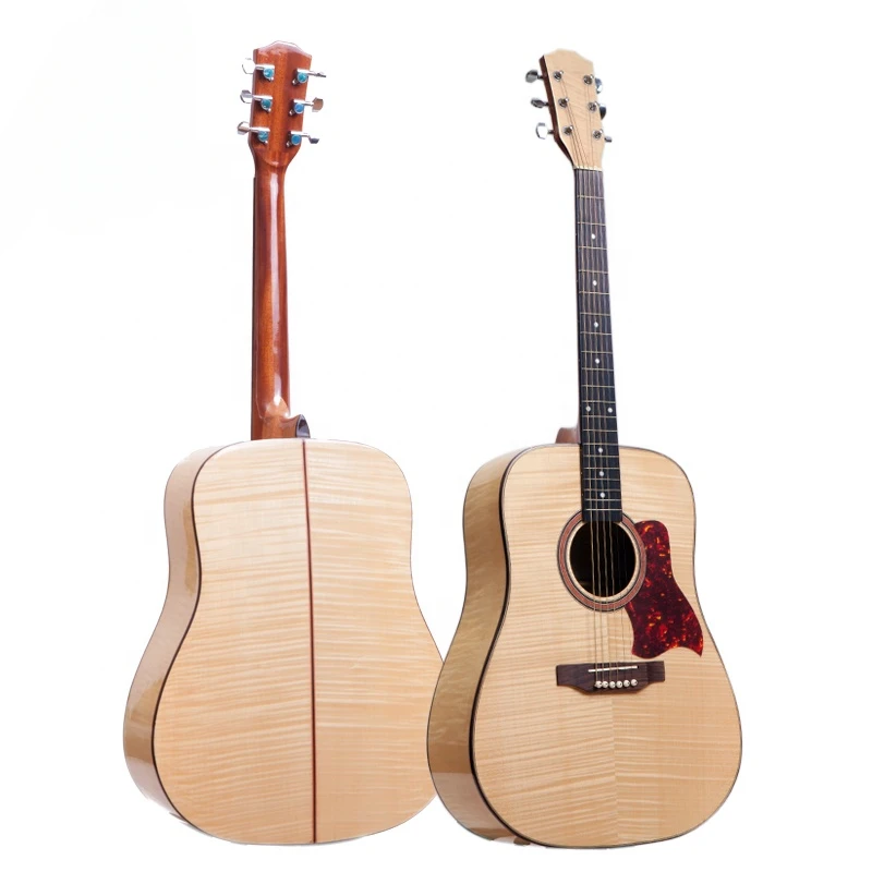 Красивая акустическая фольклорная гитара естественного цвета с рисунком пламени клена