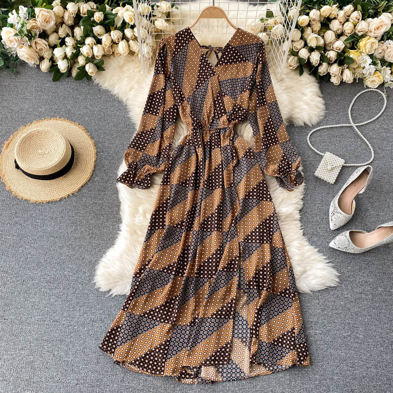 2021 New Singiny floral bohemian long girl sweet neck puff line dressed autumn print chic dress SBQ6, Light brown
