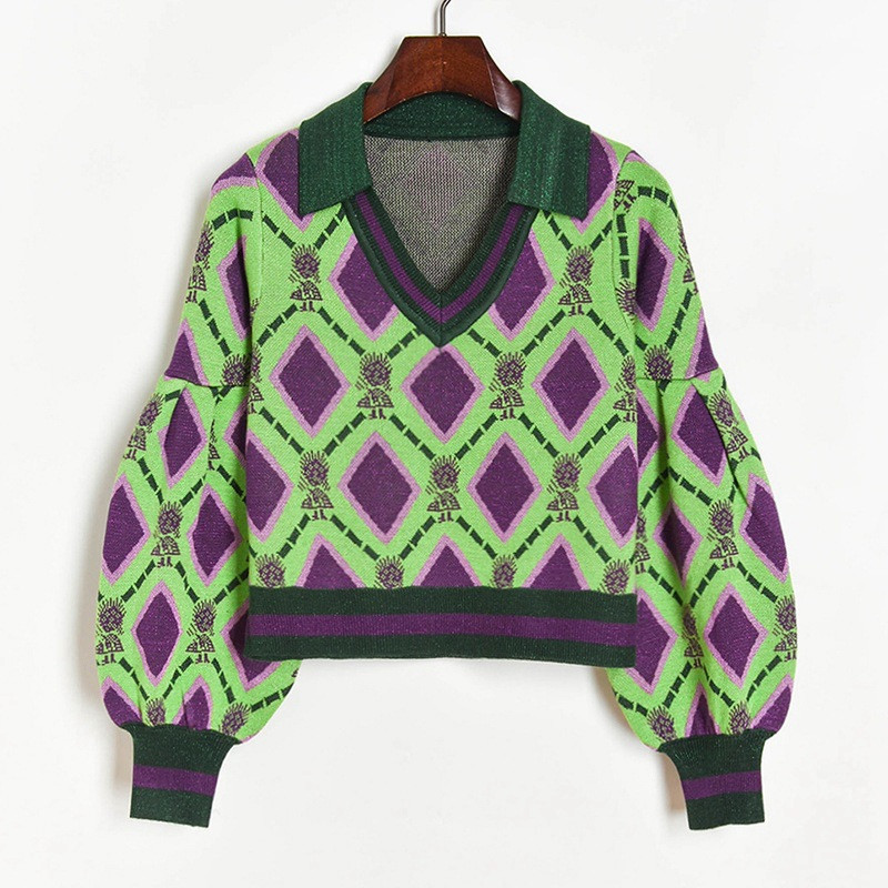2021 New Vintage Female Blouses Turn Down Collar Argyle Shirts Retro Lantern Sleeves Mesh Pullovers Fashion Jumpers POC9, Yellow.