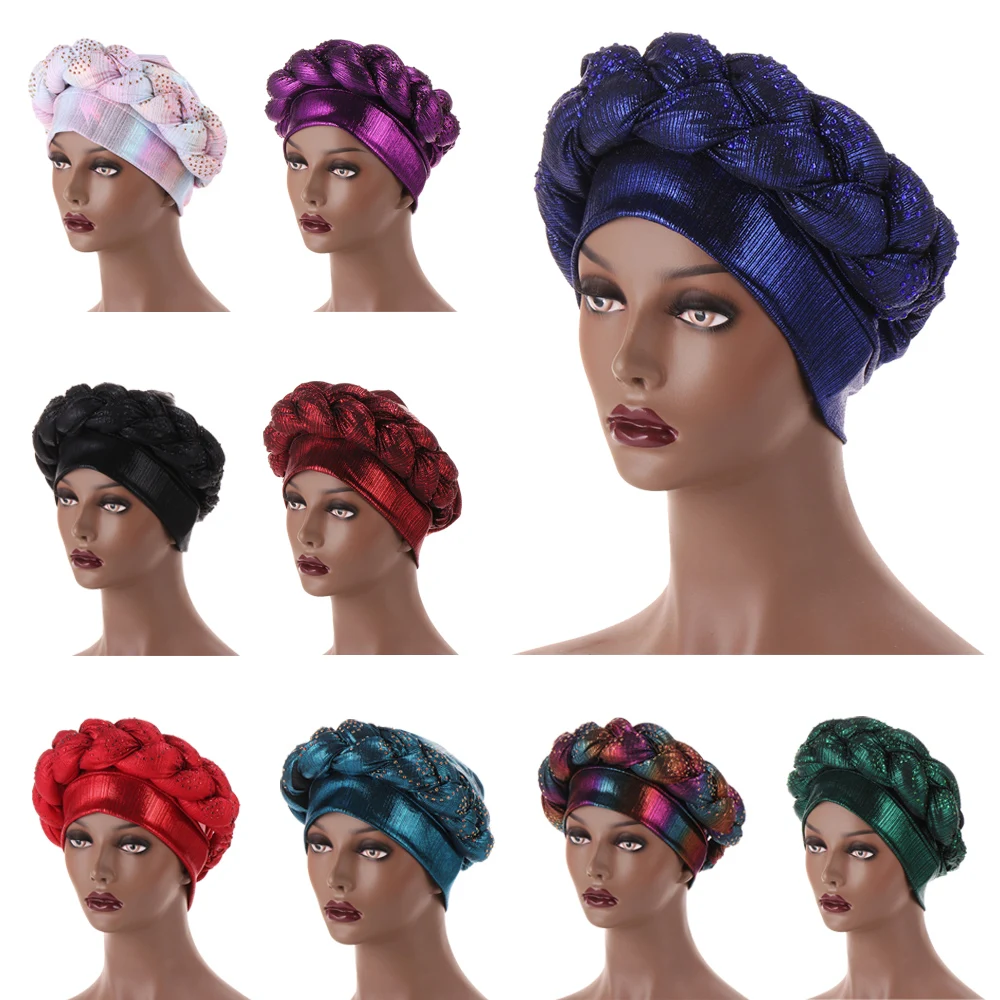 Красивый блестящий головной убор Aso Oke Gele уже изготовленный головной убор Auto Gele Aso Ebi, Африканский тюрбан с косами, женская шапка