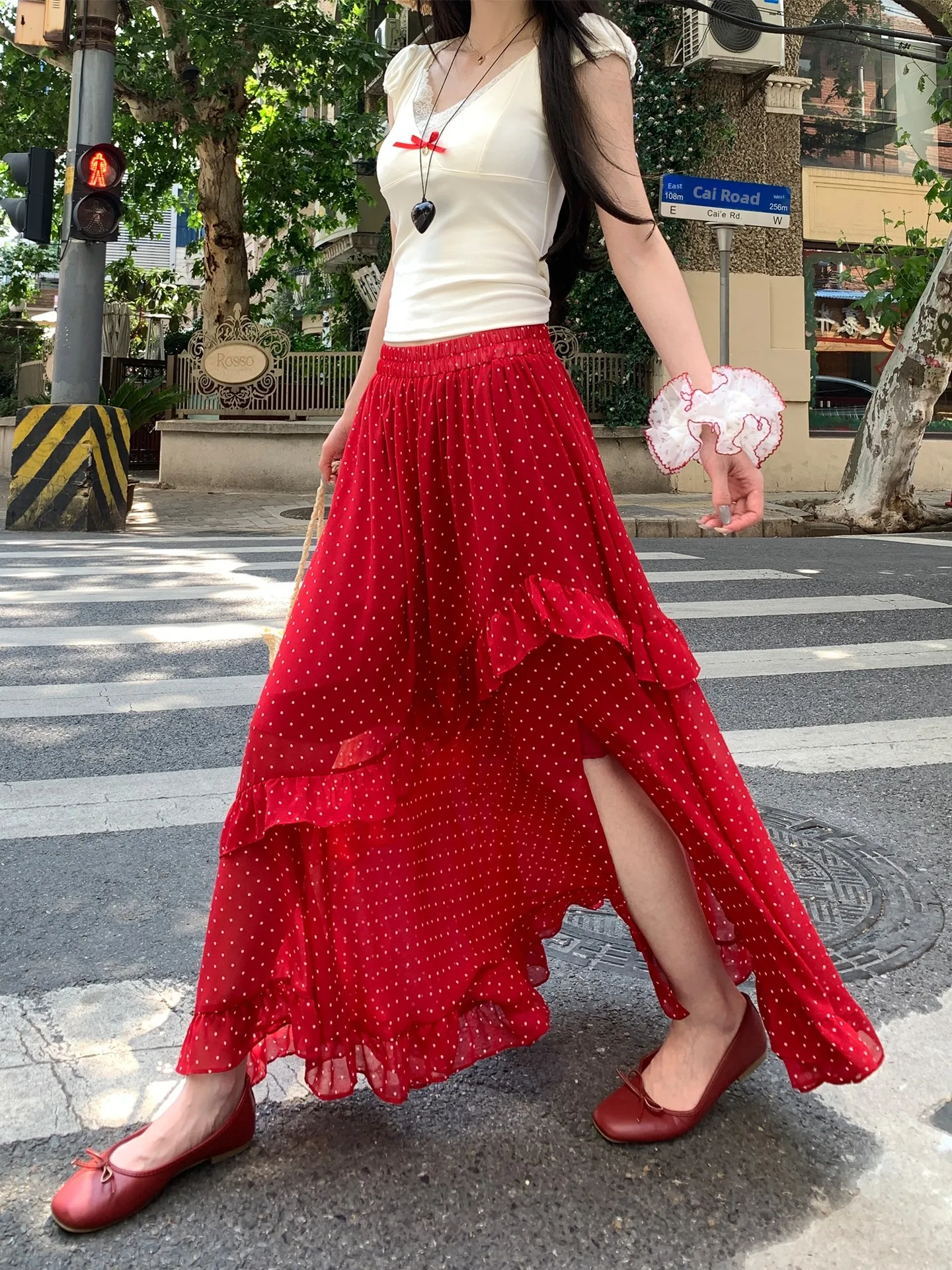 Красная асимметричная пляжная юбка в горошек, женская универсальная модная летняя новая юбка-миди для отдыха и путешествий, большая распашная юбка
