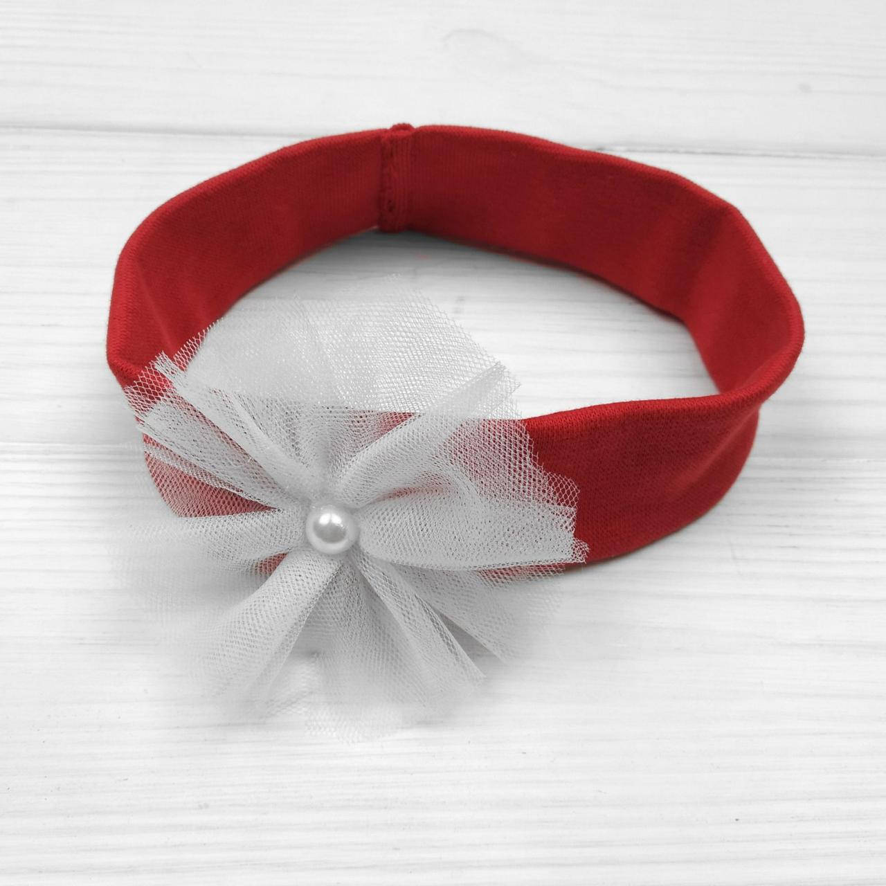 Червона пов'язочка для дівчинки пошита з інтерлоку і прикрашена фатіновим бантиком.