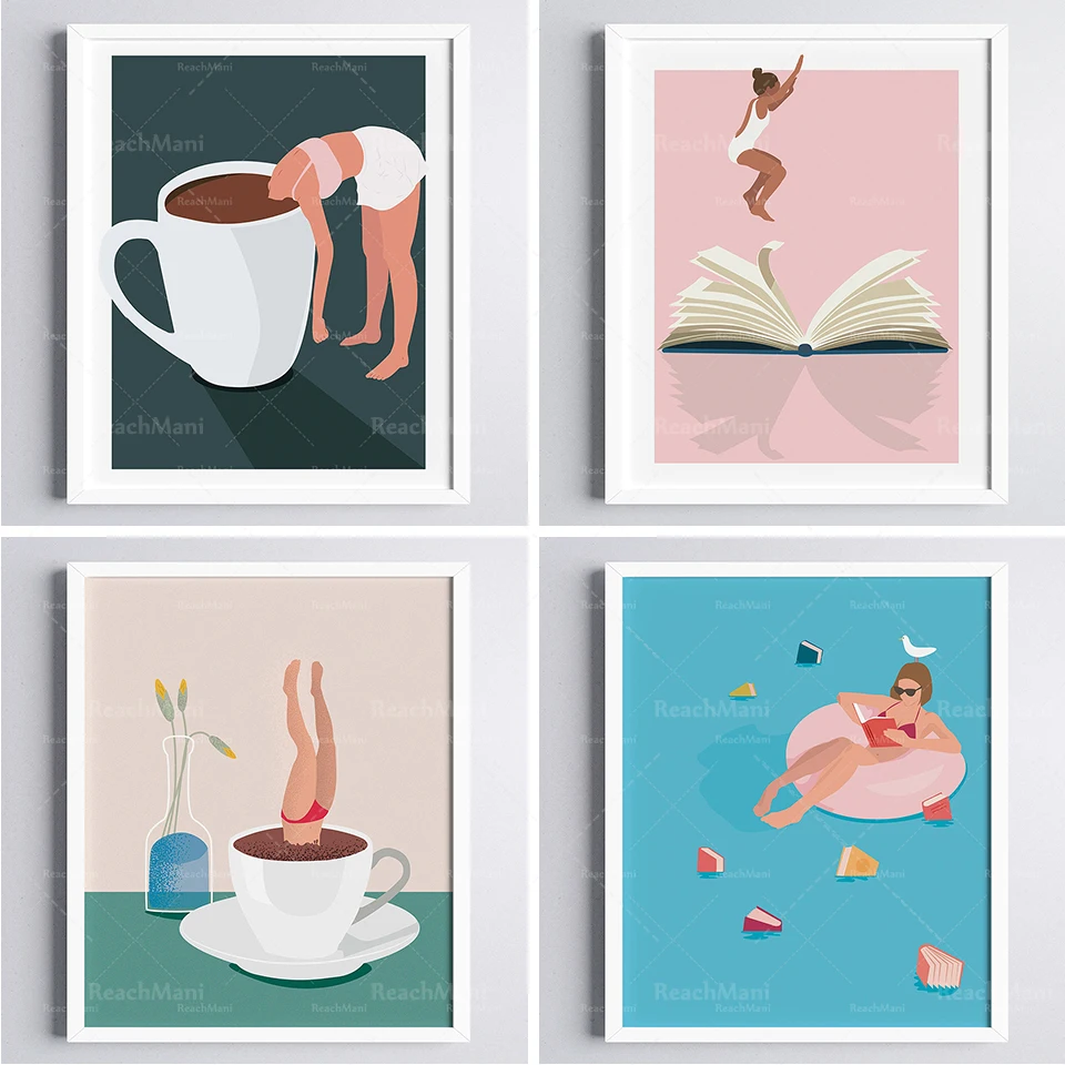 Good Morning Coffee Print | Art Print | Art Print for Book Lovers | Woman Reading Book Nordic Canvas Wall Decoration Art Poster