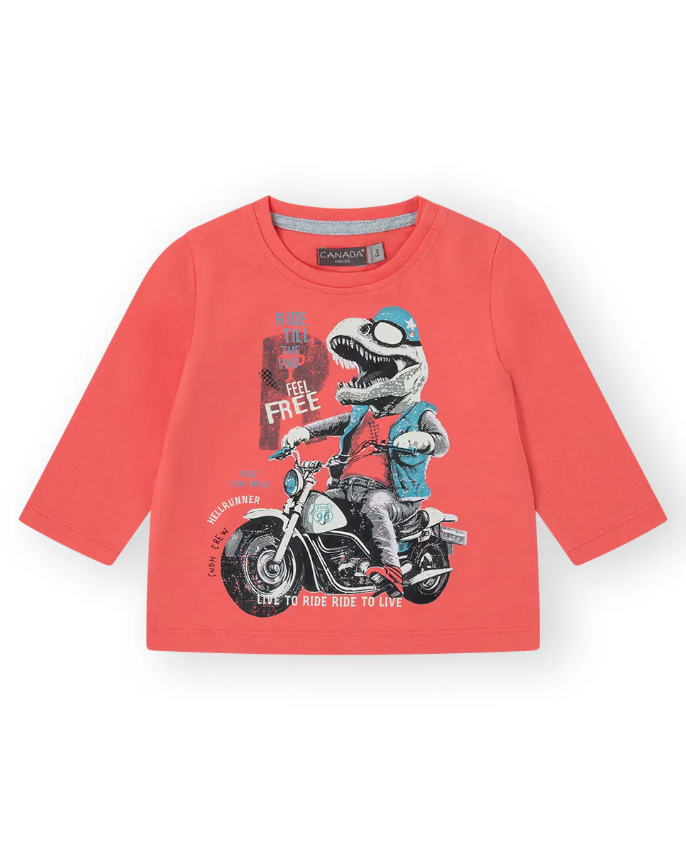 Футболка для мальчика из 100% хлопка красного цвета, с окантовкой вокруг шеи, вырезом на плече с крючками и крупным принтом с изображением мотоцикла и динозавра спереди.