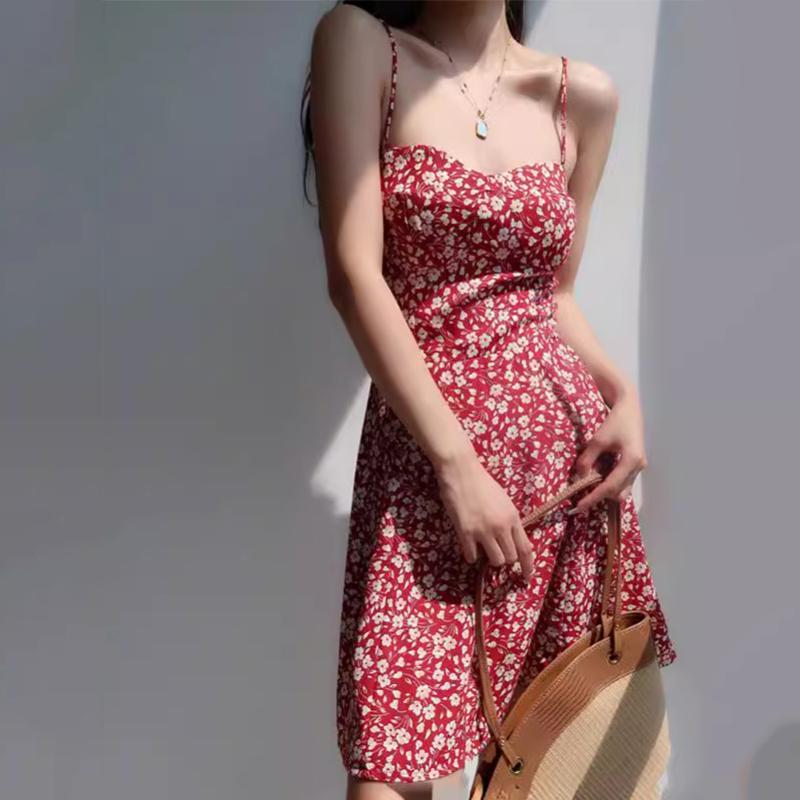 Красное платье-бретелька с цветочным принтом во французском стиле ретро для девочек, облегающее платье с короткой юбкой с тонкой талией и завязками S красный