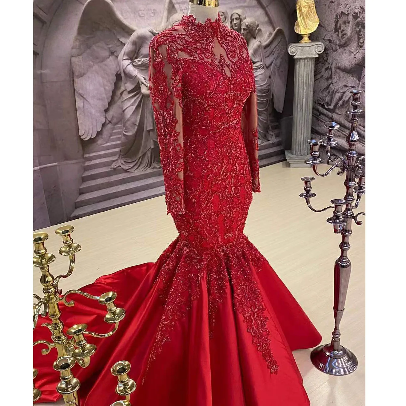Красное роскошное Новое Вечернее платье с бисером, блестками, аппликациями, высоким воротом, индивидуальный пошив, формальное платье-Русалка для выпускного вечера, платье для вечеринки