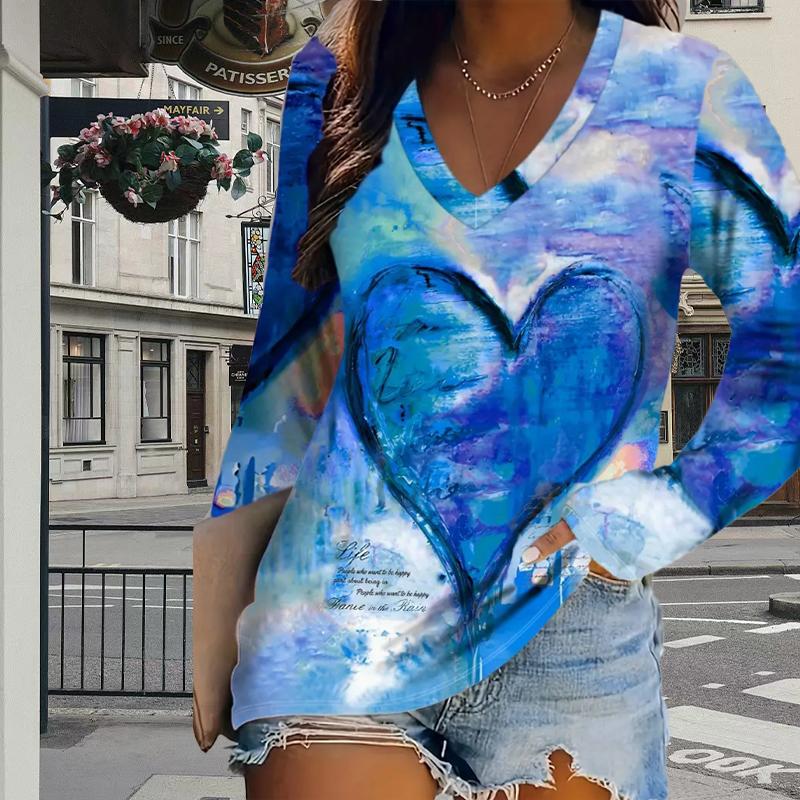 Красочные сердечки принт женские футболки женские топы с длинным рукавом V-образный вырез пуловер женские футболки футболка для женщин 3XL оранжевый