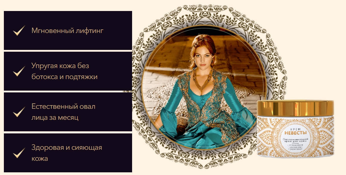 В состав крема «Крем Невесты» входят высокоактивные омолаживающие компоненты, которые избавляют от любых возрастных признаков. К ним относятся: