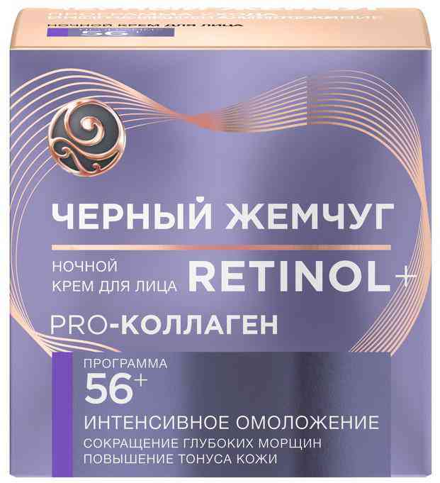 Ночной крем для лица с ретинолом Черный Жемчуг - это эффективное решение для женщин от 56 лет, стремящихся вернуть коже упругость и молодость.С возрастом на коже начинают появляться морщины, припухлости и пигментация. Обычные* увлажняющие продукты не способны справиться с этими проблемами, но крем для лица Черный Жемчуг 56+ проникает в глубокие слои эпидермиса, активируя естественные процессы восстановления клеток.PRO-коллаген обеспечивает коже интенсивное питание и увлажнение, повышая ее плотность и эластичность. Соевые протеины, входящие в состав крема, отвечают за лифтинг-эффект: они уменьшают глубину морщин и придают четкие контуры овалу лица. Омолаживающий крем от морщин для лица активизирует в коже обменные процессы, увеличивает количество молодых клеток и снижает проявление признаков старения.При регулярном использовании продукта вы заметите значительное улучшение состояния кожи: исчезнут сухость и шелушение, уменьшится пигментация. Крем с ретинолом для лица делает кожу более гладкой и подтянутой, придает ей ровный и здоровый тон. Крем с эффектом лифтинга для лица обладает плотной текстурой, благодаря чему продукт расходуется экономично. Рекомендуется наносить его вечером на предварительно очищенное лицо, равномерно распределяя легкими массирующими движениями.Используйте крем-лифтинг для лица 56+, чтобы ваша кожа вновь засияла молодостью и красотой!Чтобы достичь максимального эффекта, используйте крем против морщин для лица 56+ в сочетании с другими продуктами из линейки Ретинол+. Попробуйте дневной крем для лица и крем для век, а еще сыворотку и маску – и наслаждайтесь безупречной красотой своей кожи!*обычные - не содержащие антивозрастных активных ингредиентов.