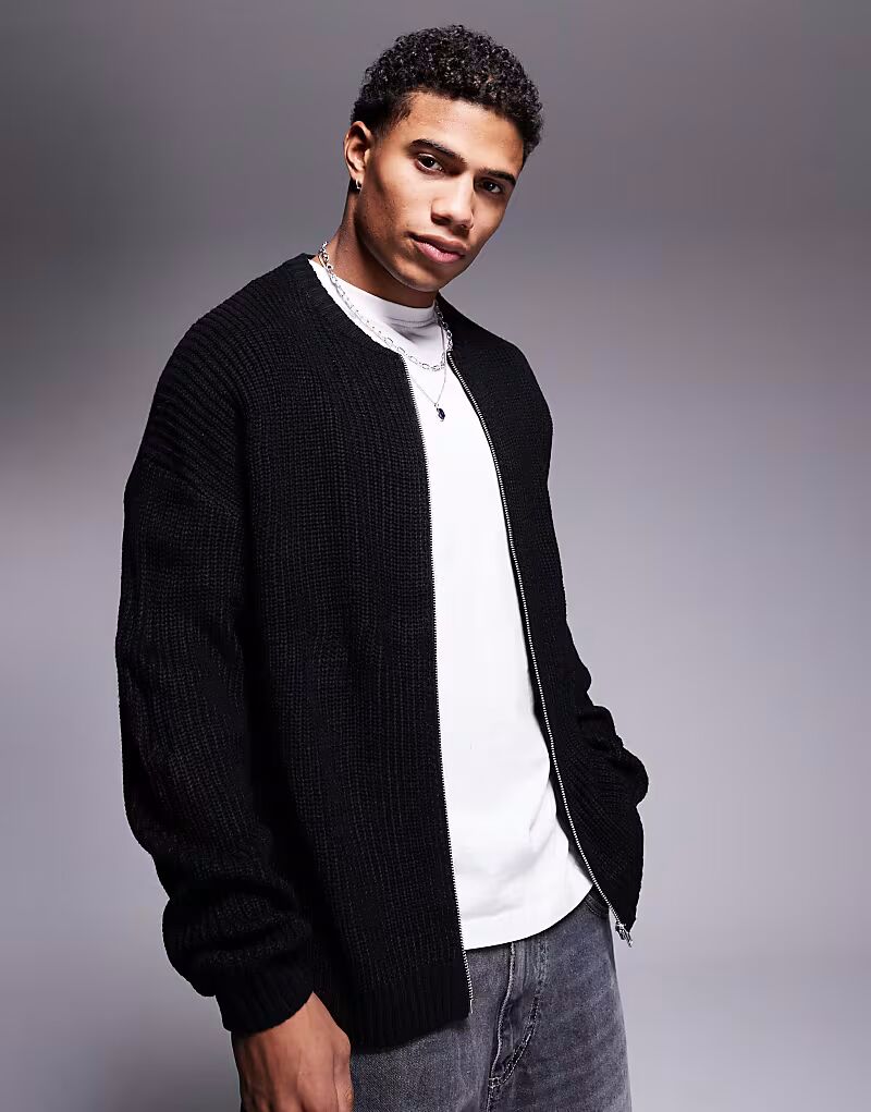 Свободный трикотажный бомбер в стиле рыбацкой вязки на молнии ASOS DESIGN черного цвета