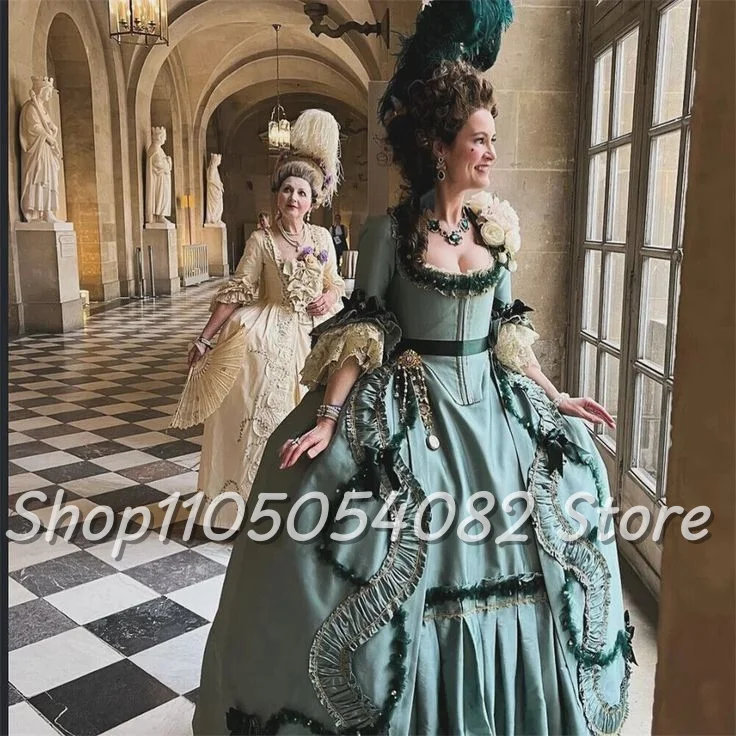 Средневековое зеленое бальное платье Tudor по индивидуальному заказу, с круглым вырезом, с рюшами и половиной рукавов, с кружевными рюшами, великолепное вечернее платье трапециевидной формы с рюшами и бисером