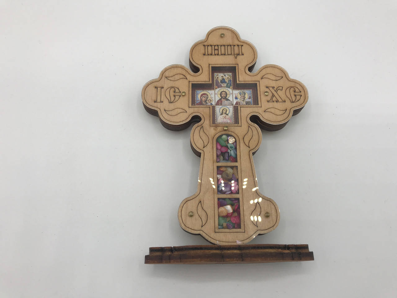 Настольный крест из дерева, как основной атрибут Православной веры, можно купить для храма, чтобы установить за царскими воротами, или для дома, чтобы использовать как оберег, применять в процессе чтения молитв. Благодаря тому, что крест деревянный, он отличается особой долговечностью, поэтому может передаваться из поколения в поколение. Исполнен атрибут по всем правилам веры – на лицевой его части присутствует фигура распятого Иисуса Христа, на концах креста нанесены соответствующие надписи, в окошках вставки с камнями. Подставка достаточно устойчивая, украшена оригинальным узором.