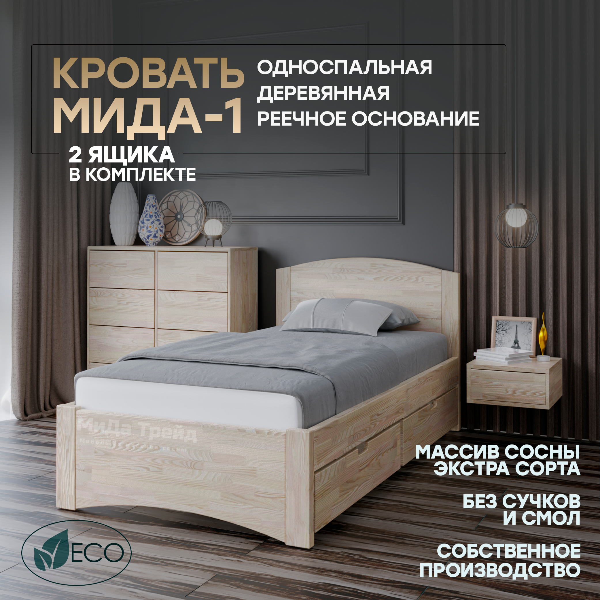 Кровать МиДа Трейд МиДа-1 с 2 ящиками 90х180 из массива сосны, без покрытия, Бежевый, МиДа-1