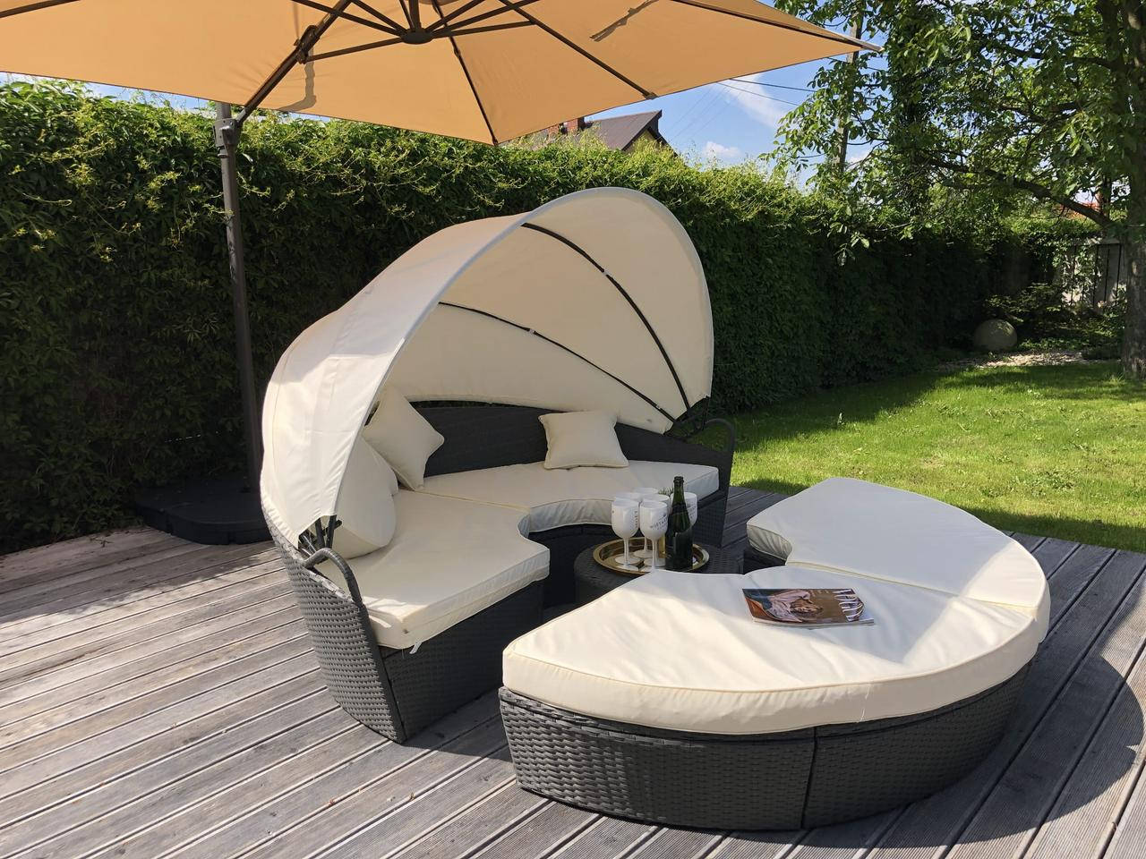 Никогда еще ваш отдых на природе не был столь изысканным и роскошным! Патио-сад представляет вашем вниманию эксклюзивное предложение от европейского производителя - уникальная круглая кровать-шезлонг, которая легко превратиться в удобный диван с навесом и полукруглый пуф. Комплект выполнен из высококачественного искусственного ротанга, легко моется, чрезвычайно практичен и долговечен.