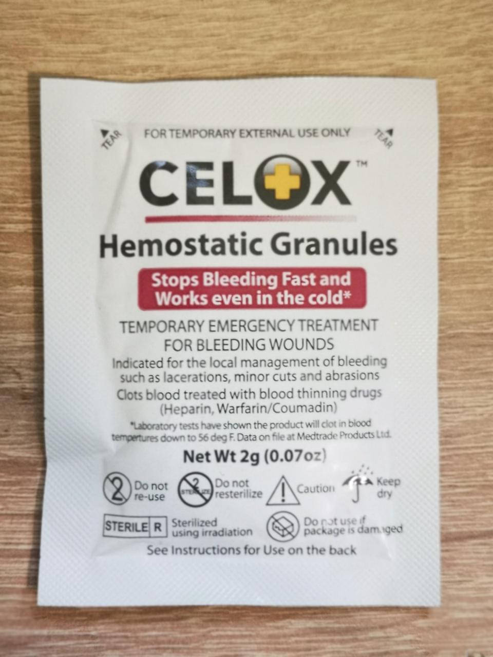 Celox — это высокоэффективное кровоостанавливающее средство (гемостатик) на основе натурального природного вещества хитозана. Целокс способен остановить смертельное кровотечение из бедренной артерии примерно за 3 минуты, а более мелкие кровотечения — за несколько секунд.При контакте с кровью гранулы Celox впитывают жидкость, набухают и склеиваются в единую гелиево-желеобразную массу, образуя единый плотный сгусток. Celox работает путем воздействия на эритроциты (красные клетки крови) и на жидкости в крови, путем смешивания и "склеивания" их между собой, что в итоге позволяет получить псевдо "сгусток". Этот сгусток хорошо прилипает к влажным местам, что позволяет закупорить отверстие кровотечения. Таким образом, Celox не запускает естественный кровосвертывающий каскад, что сильно ее экономит — он всего лишь свертывает ту кровь, с которой непосредственно вступает в контакт.
