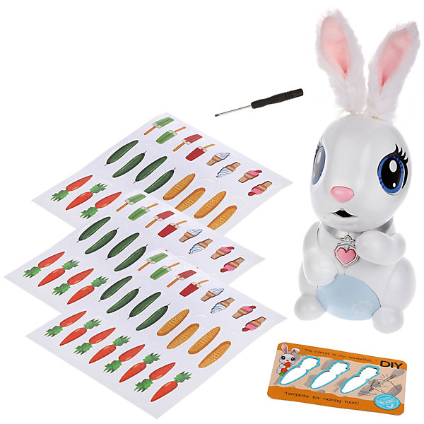 Интерактивный питомец снабжен встроенными спецэффектами: при поглаживании игрушки по голове он издает реалистичные звуки, а при нажатии на кулон-сердечко играют 3 различные мелодии. Кролик с удовольствием поедает бумажные морковь, кукурузу, огурцы и мороженое из комплекта.