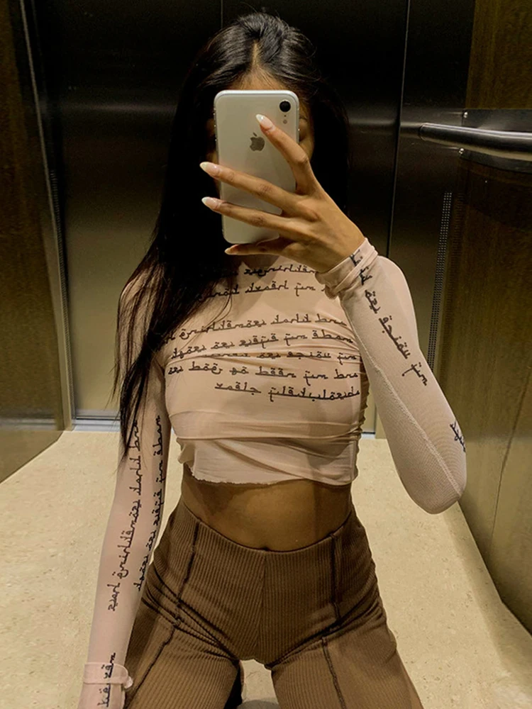 Кроп-топ женский с круглым вырезом, модная Клубная одежда, пикантная Прозрачная Футболка с длинным рукавом и надписью, Y2K, лето 2023